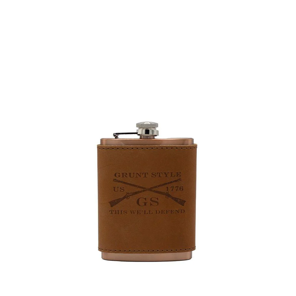 Take your favorite drink with you wherever you go with this Grunt Style Leather Wrapped Flask! There is nothing we love more than Whiskey and Freedom - so we combined the two! Enjoy your Whiskey freely wherever you choose! The logo leather flasks features a Grunt Style logo stamp, making it the most patriotic flask around! Don't wait, add it to your cart today!